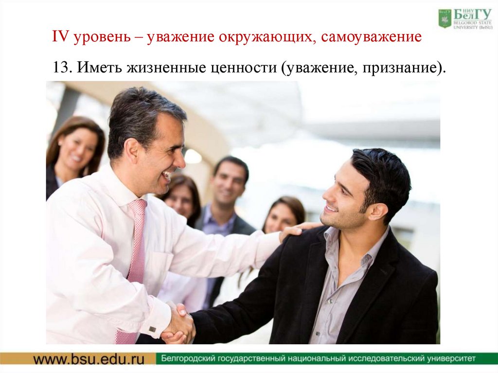 IV уровень – уважение окружающих, самоуважение13. Иметь жизненные ценности (уважение, признание).