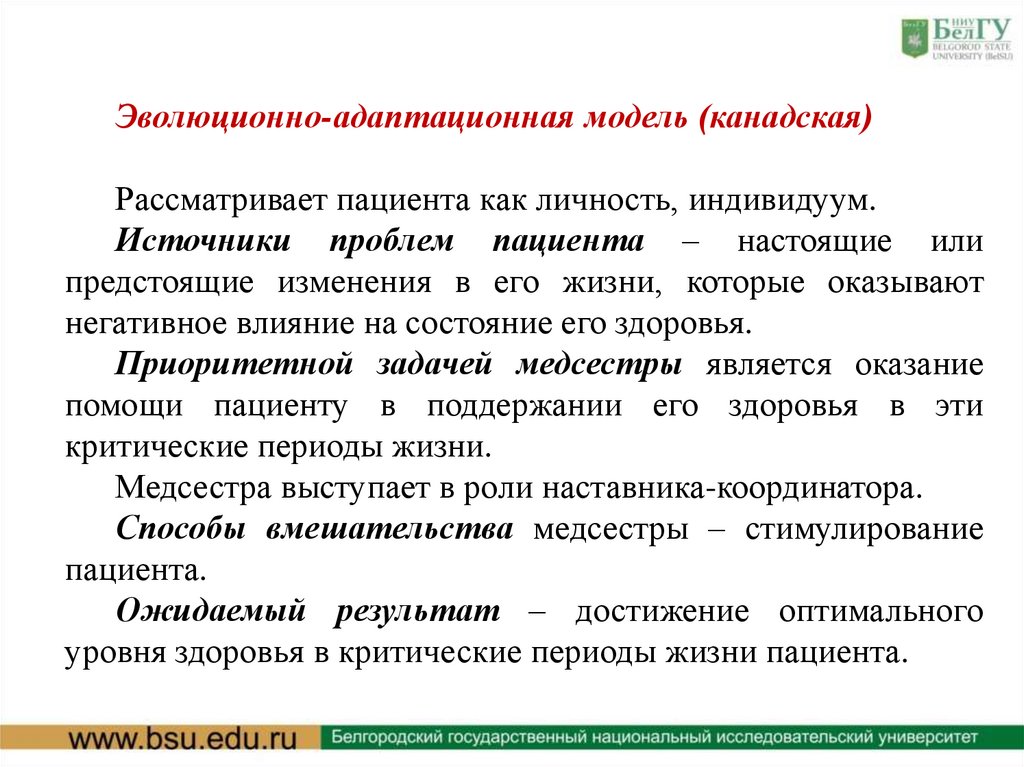 Эволюционно-адаптационная модель (канадская)Рассматривает пациента как личность, индивидуум.