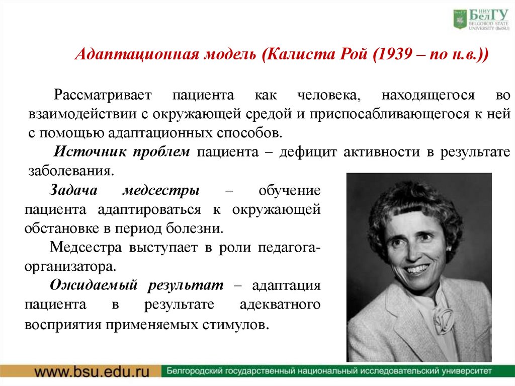 Адаптационная модель (Калиста Рой (1939 – по н.в.))Рассматривает пациента как человека, находящегося во