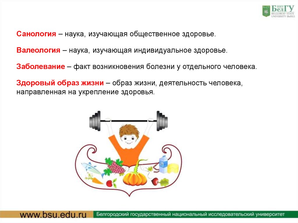 Санология – наука, изучающая общественное здоровье.Валеология – наука, изучающая индивидуальное здоровье.