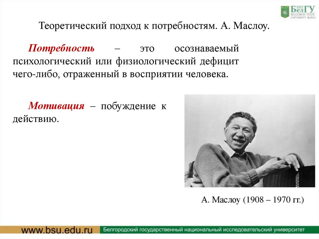 Теоретический подход к потребностям. А. Маслоу.Потребность