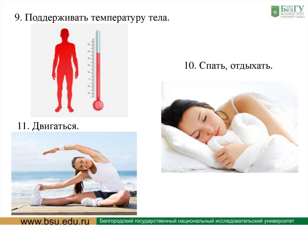 9. Поддерживать температуру тела.10. Спать, отдыхать.