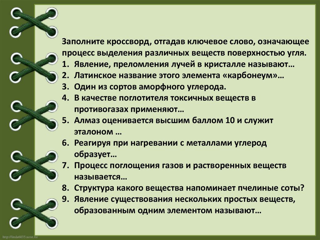 Заполните кроссворд, отгадав ключевое слово, означающеепроцесс выделения различных веществ поверхностью угля.