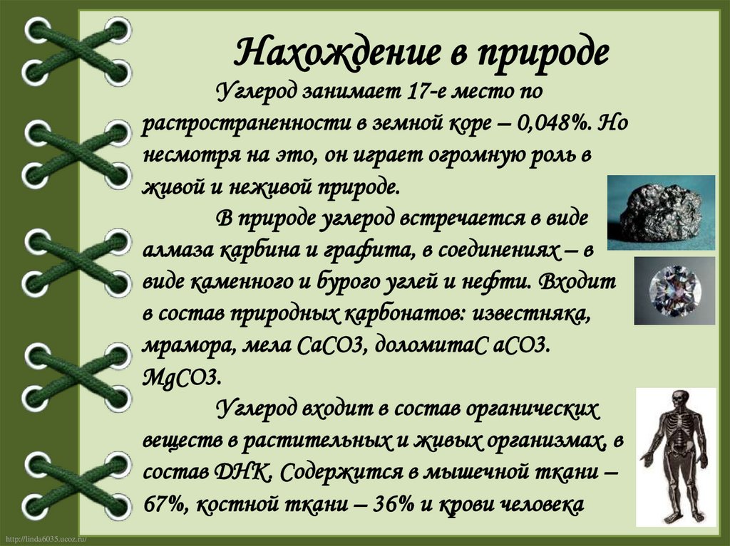 Нахождение в природеУглерод занимает 17-е место по