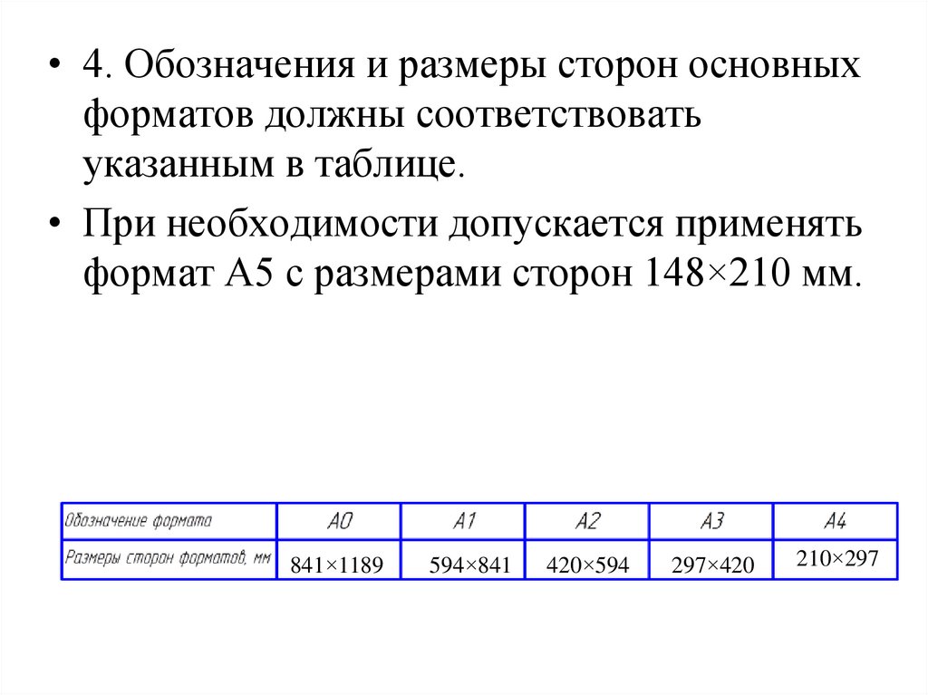 • 4. Обозначения и размеры сторон основныхформатов должны соответствовать