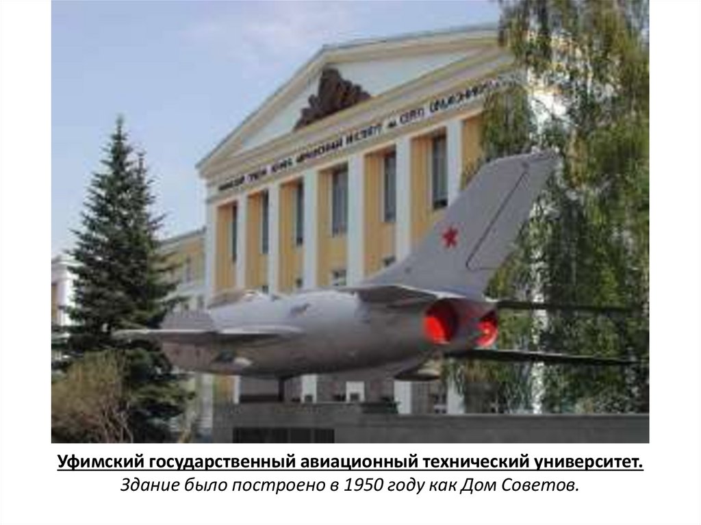 Уфимский государственный авиационный технический университет.Здание было построено в 1950 году как Дом Советов.