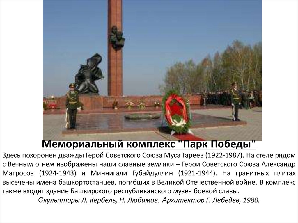 Мемориальный комплекс "Парк Победы"Здесь похоронен дважды Герой Советского Союза Муса Гареев (1922-1987). На стеле рядом