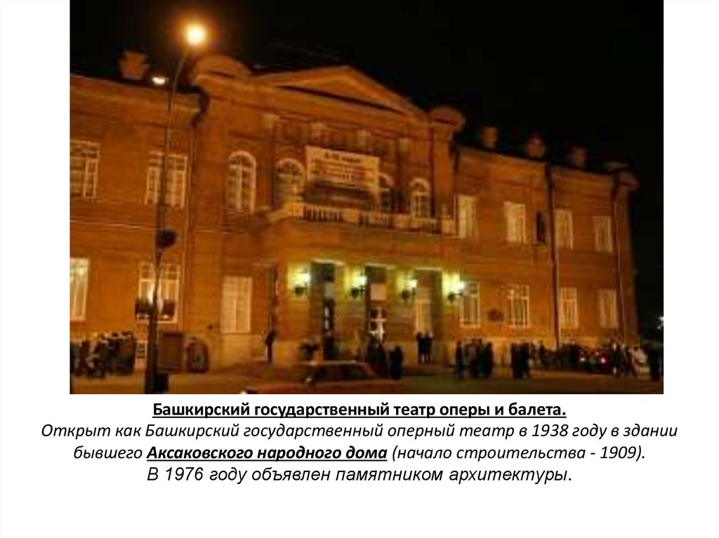 Башкирский государственный театр оперы и балета.Открыт как Башкирский государственный оперный театр в 1938 году в здании