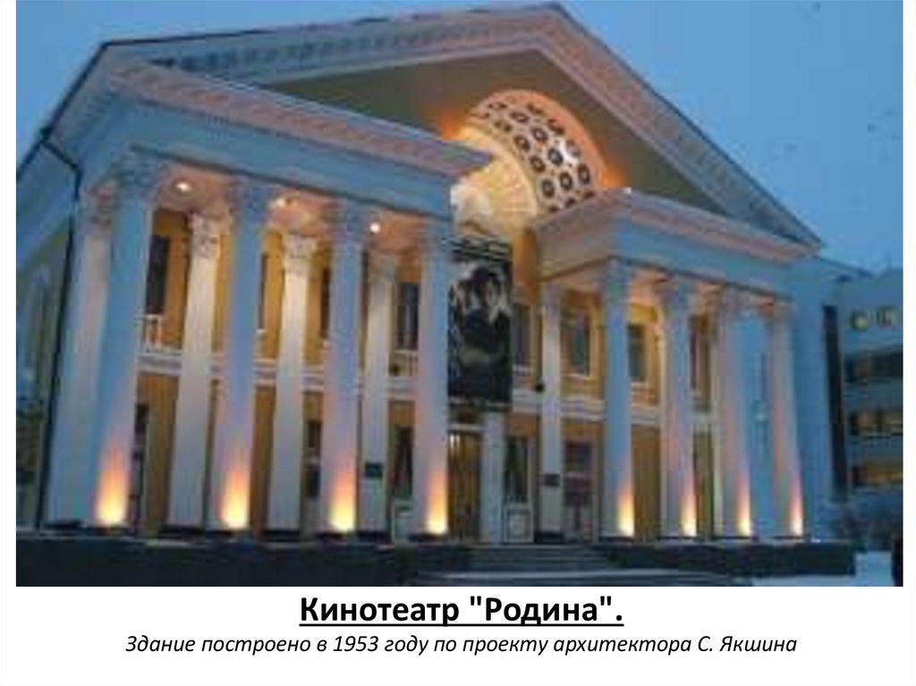 Кинотеатр "Родина".Здание построено в 1953 году по проекту архитектора С. Якшина