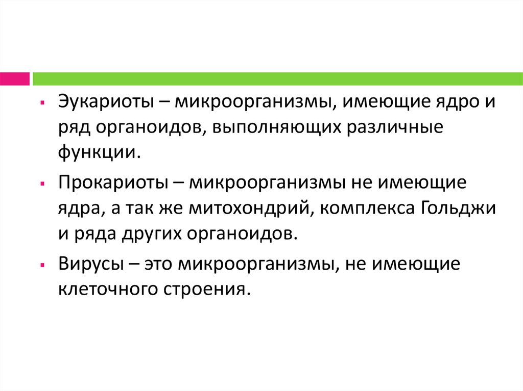 Эукариоты – микроорганизмы, имеющие ядро иряд органоидов, выполняющих различные
