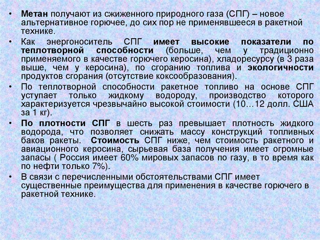 • Метан получают из сжиженного природного газа (СПГ) – новоеальтернативное горючее, до сих пор не применявшееся в ракетной
