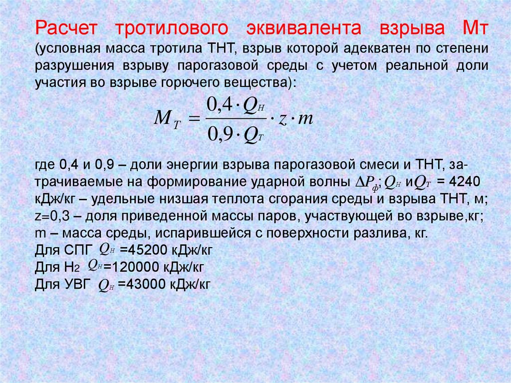 Расчет тротилового эквивалента взрыва Мт(условная масса тротила ТНТ, взрыв которой адекватен по степени
