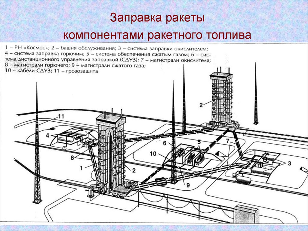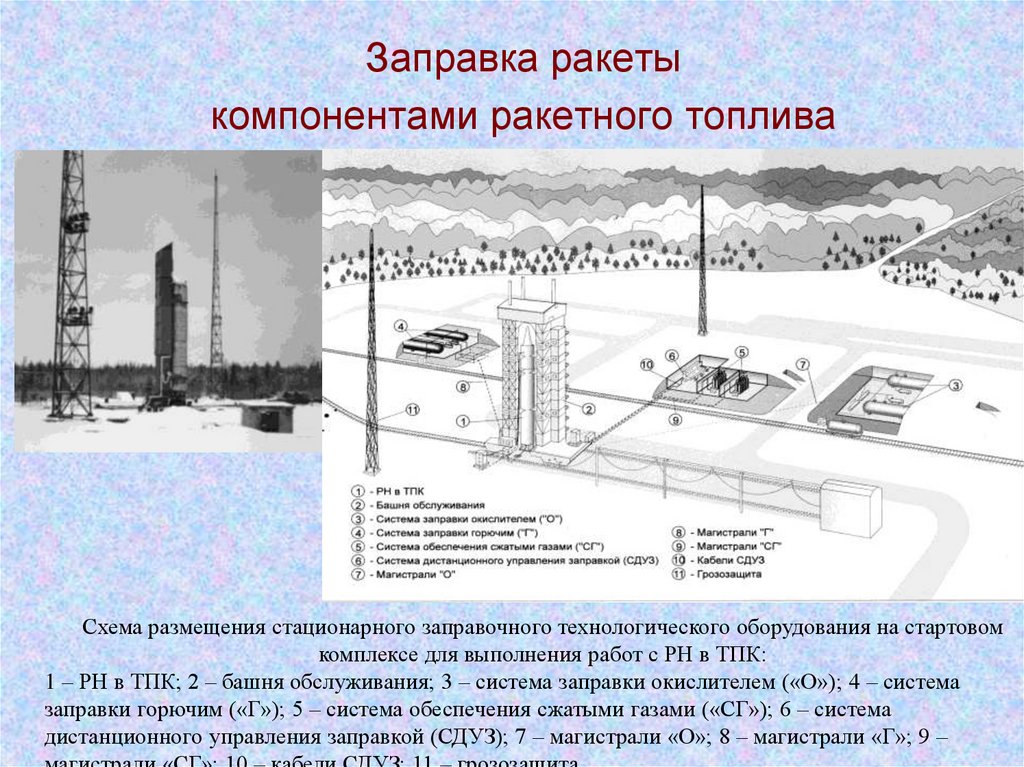1 – РН в ТПК; 2 – башня обслуживания; 3 – система заправки окислителем («О»); 4 – система