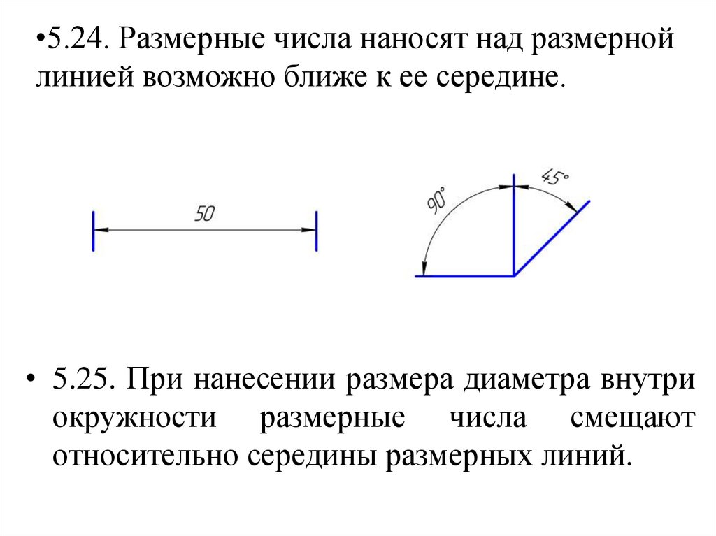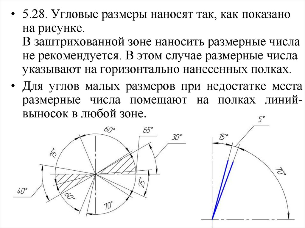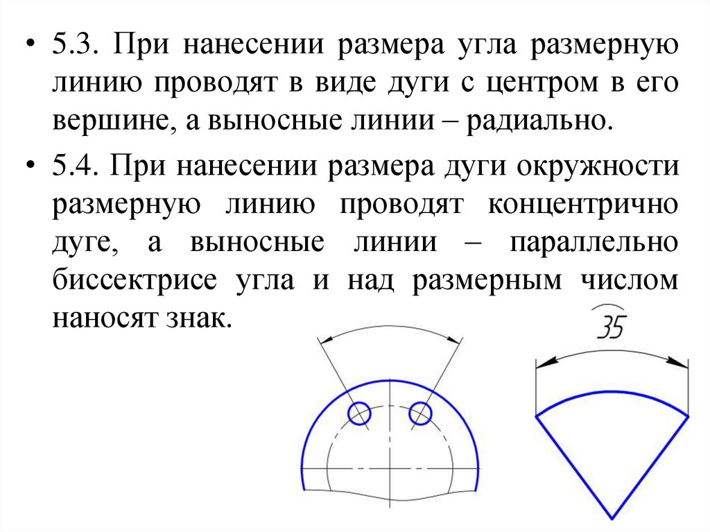 • 5.3. При нанесении размера угла размернуюлинию проводят в виде дуги с центром в его