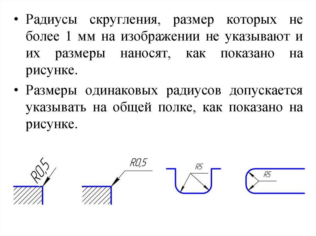 • Радиусы скругления, размер которых неболее 1 мм на изображении не указывают и