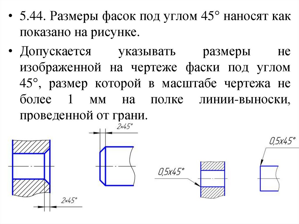 • 5.44. Размеры фасок под углом 45° наносят какпоказано на рисунке.