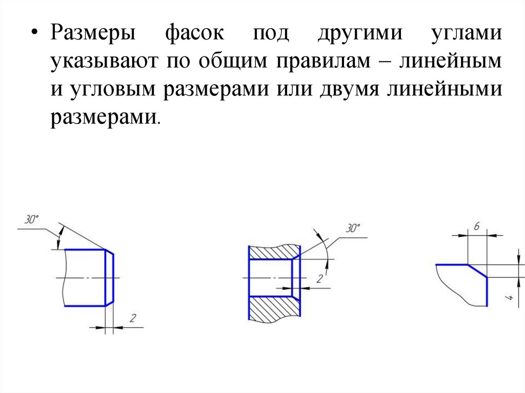 • Размеры фасок под другими угламиуказывают по общим правилам – линейным