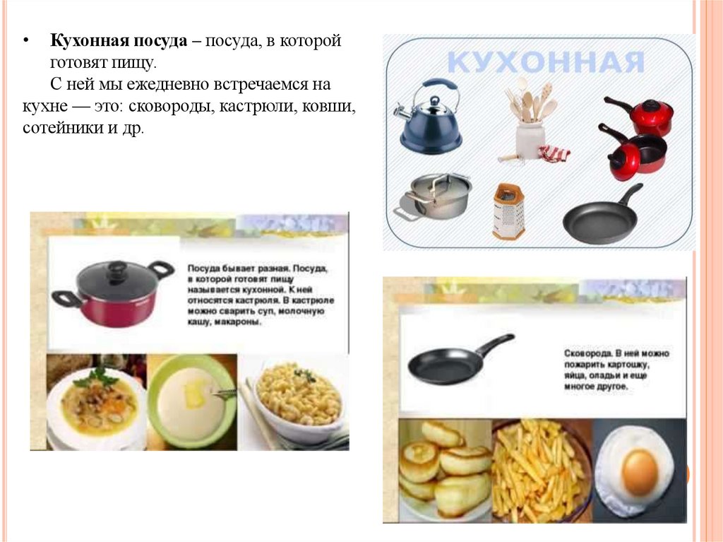 2. Я сейчас готовить буду. Соберу на стол посуду. Вот КАСТРЮЛЯ, ПОВАРЁШКА, СКОВОРОДКА, ВИЛКА, ЛОЖКА. Небольшой столовый НОЖИК Мне