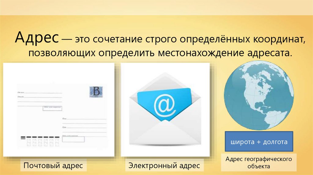 Адрес — это сочетание строго определённых координат,позволяющих определить местонахождение адресата.