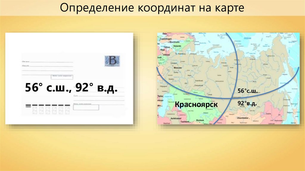 Определение координат на карте56° с.ш., 92° в.д.