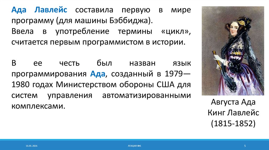 Ада Лавлейс составила первую в мирепрограмму (для машины Бэббиджа).