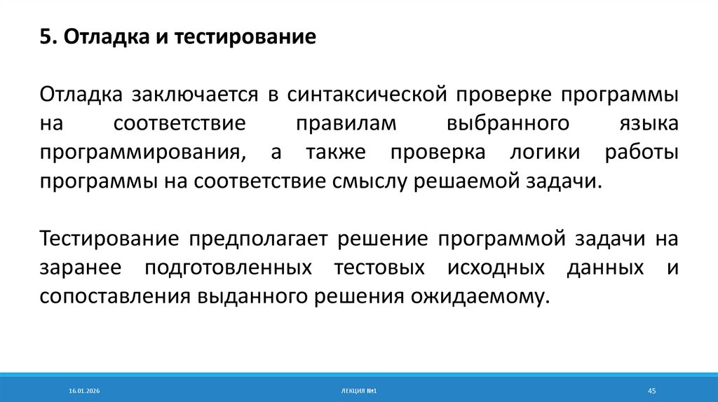 5. Отладка и тестированиеОтладка заключается в синтаксической проверке программы