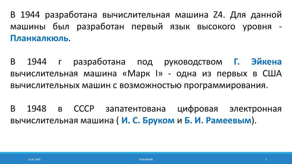 В 1944 разработана вычислительная машина Z4. Для данноймашины был разработан первый язык высокого уровня Планкалкюль.