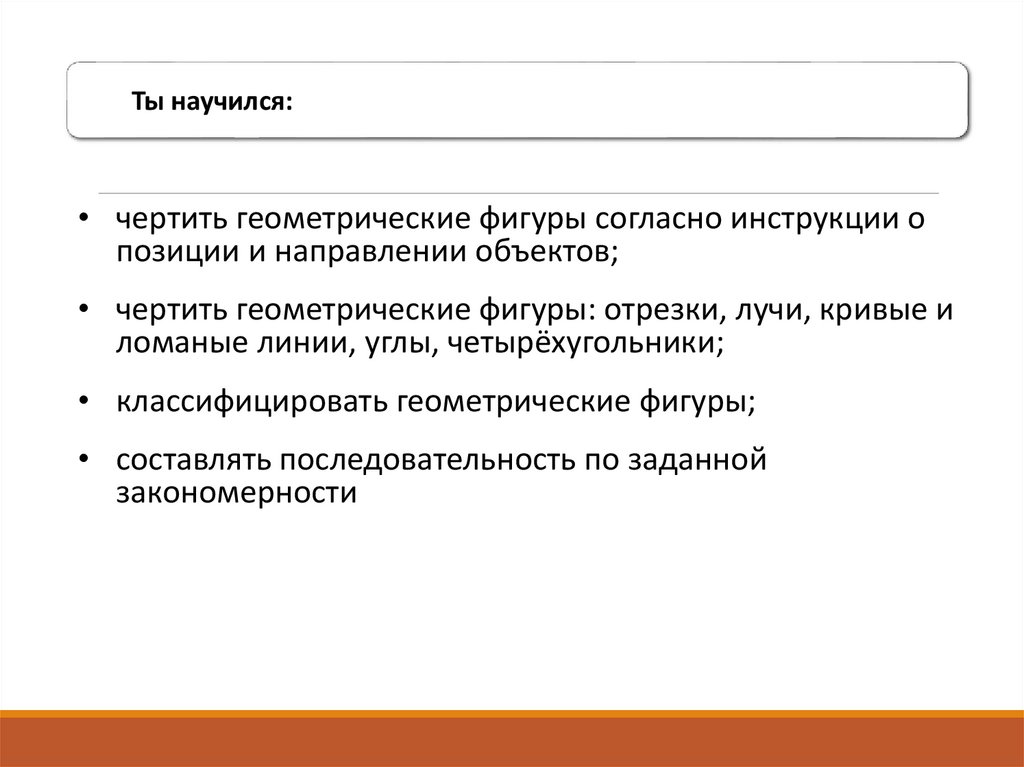 Ты научился:• чертить геометрические фигуры согласно инструкции о