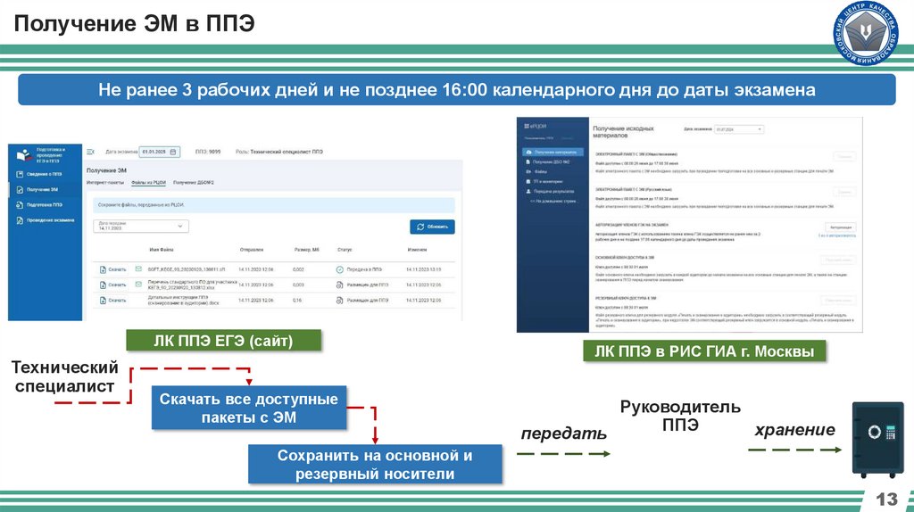 в ЛК ППЭ ЕГЭ (сайт) при участии члена ГЭК с использованием токена члена ГЭК выполняет передачу: