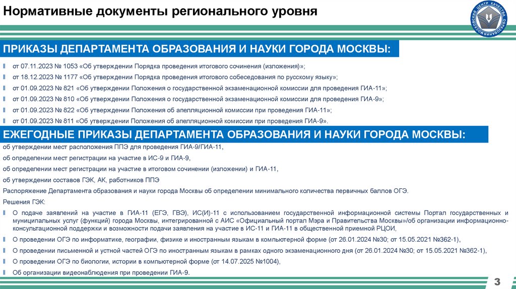 Нормативные документы регионального уровняПРИКАЗЫ ДЕПАРТАМЕНТА ОБРАЗОВАНИЯ И НАУКИ ГОРОДА МОСКВЫ: