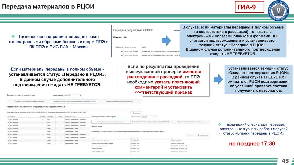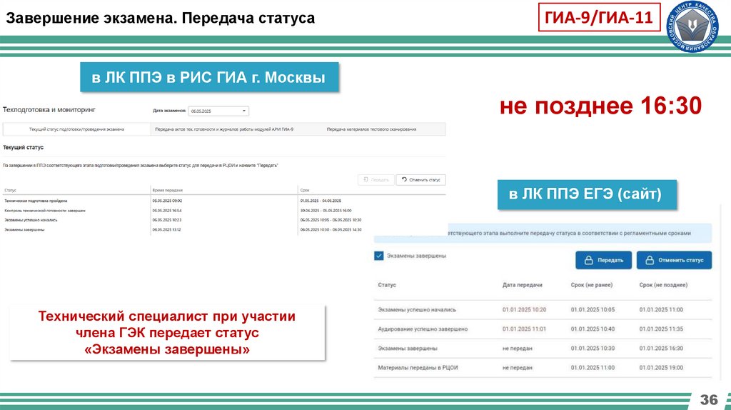 электронных журналов работы основной и резервной Станций Штаба ППЭ и статуса «Материалы переданы в РЦОИ»;