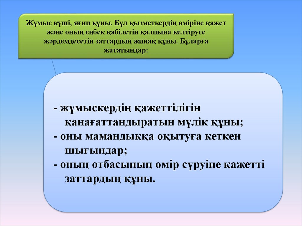 Жұмыс күші, яғни құны. Бұл қызметкердің өміріне қажетжәне оның еңбек қабілетін қалпына келтіруге