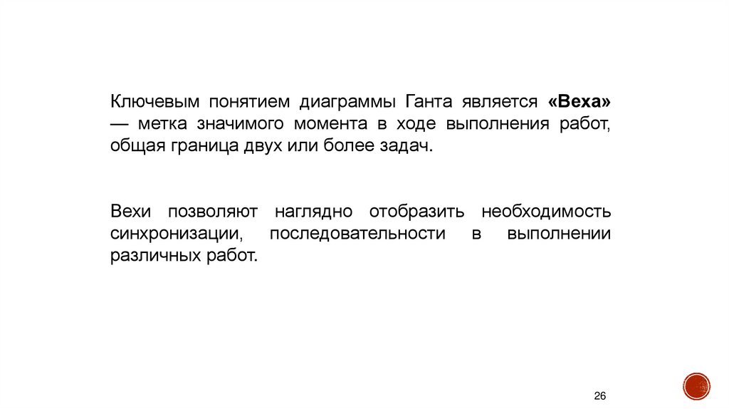 Ключевым понятием диаграммы Ганта является «Веха»— метка значимого момента в ходе выполнения работ,