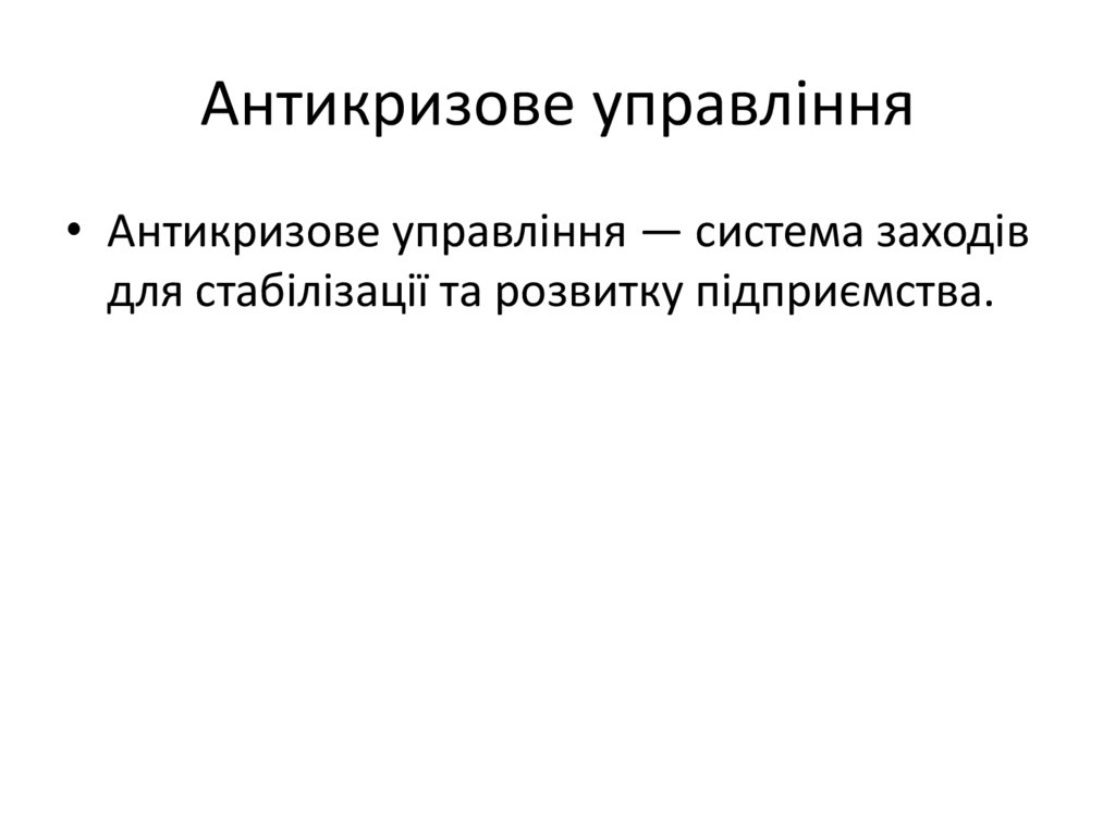 • Антикризове управління — система заходівдля стабілізації та розвитку підприємства.