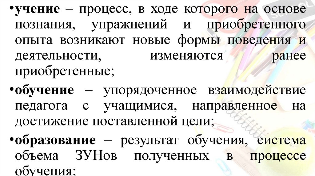 •учение – процесс, в ходе которого на основепознания, упражнений и приобретенного