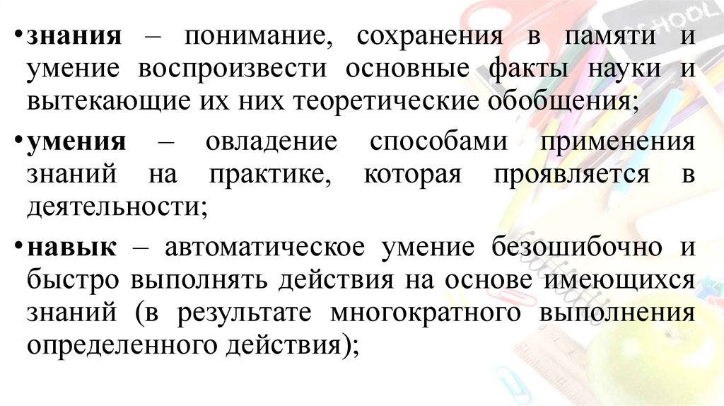 • знания – понимание, сохранения в памяти иумение воспроизвести основные факты науки и