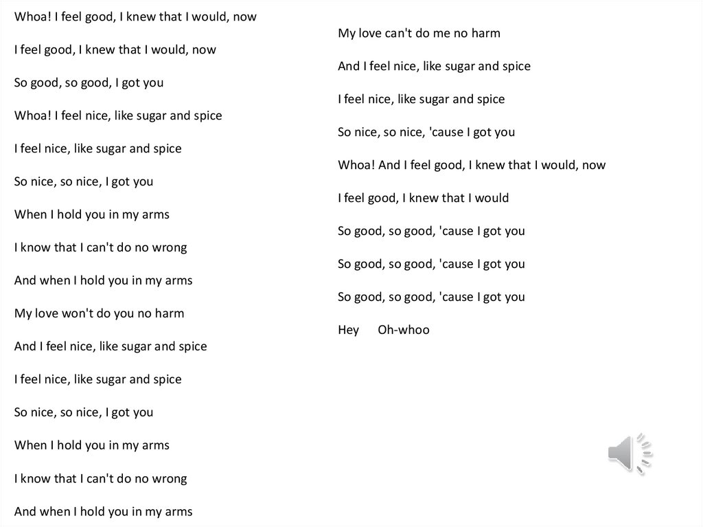 Whoa! I feel good, I knew that I would, nowMy love can't do me no harm