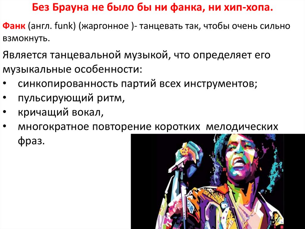 Без Брауна не было бы ни фанка, ни хип-хопа.Фанк (англ. funk) (жаргонное )- танцевать так, чтобы очень сильно