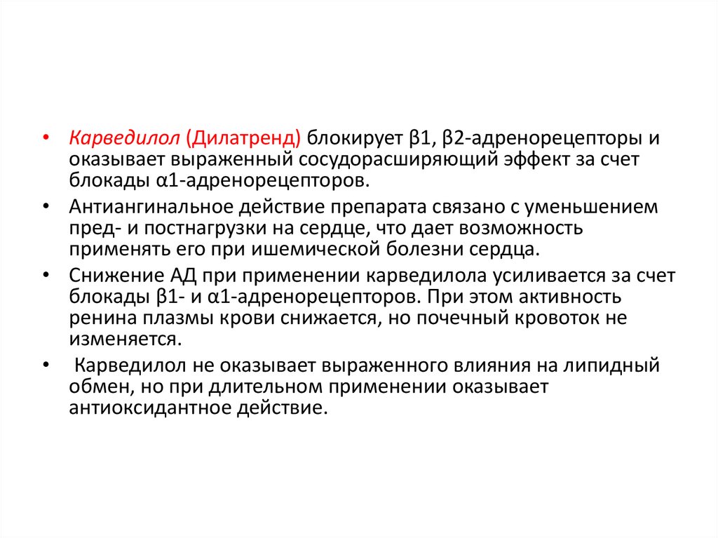 • Карведилол (Дилатренд) блокирует β1, β2-адренорецепторы иоказывает выраженный сосудорасширяющий эффект за счет