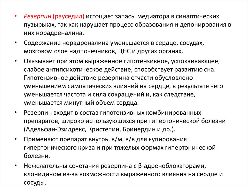 • Нежелательны сочетания резерпина с β-адреноблокаторами,