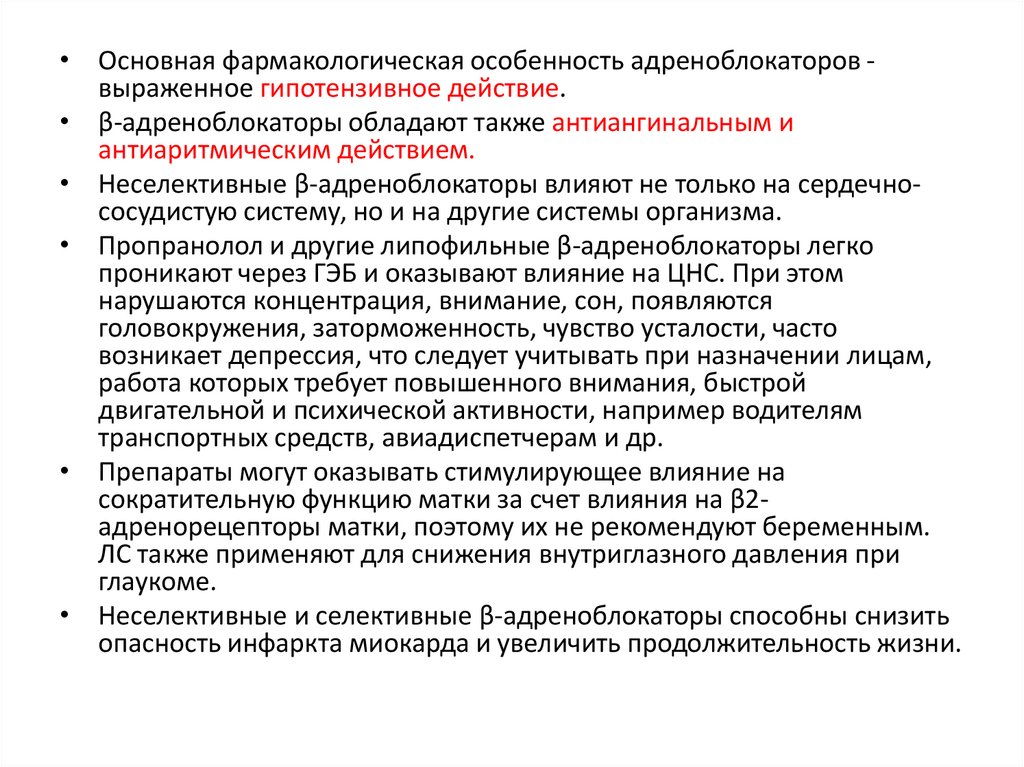 • Основная фармакологическая особенность адреноблокаторов выраженное гипотензивное действие.• β-адреноблокаторы обладают также антиангинальным и