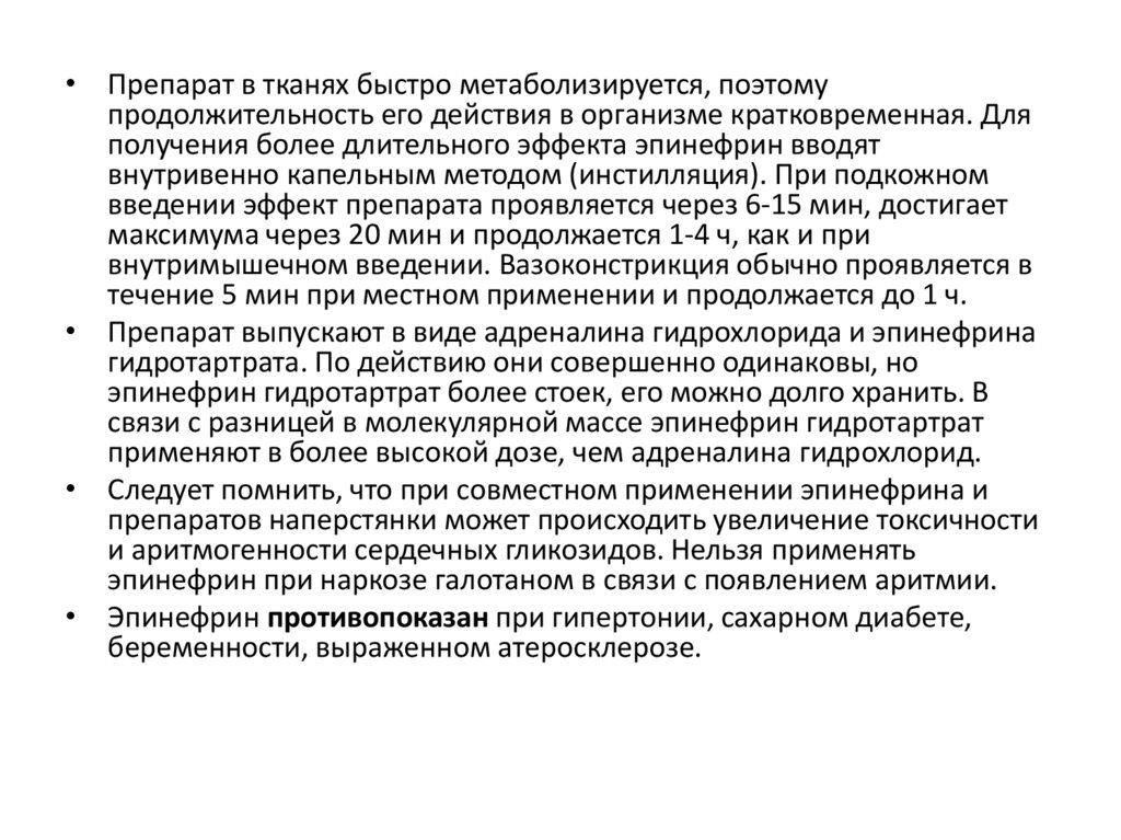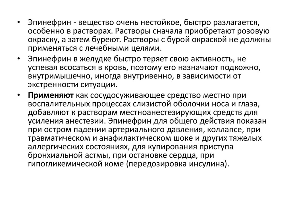 • Эпинефрин в желудке быстро теряет свою активность, не