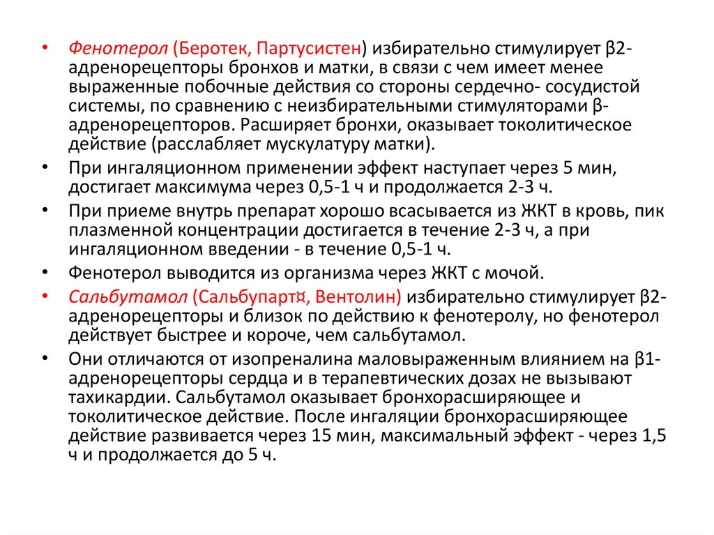 • Фенотерол (Беротек, Партусистен) избирательно стимулирует β2адренорецепторы бронхов и матки, в связи с чем имеет менеевыраженные побочные действия со стороны сердечно- сосудистой