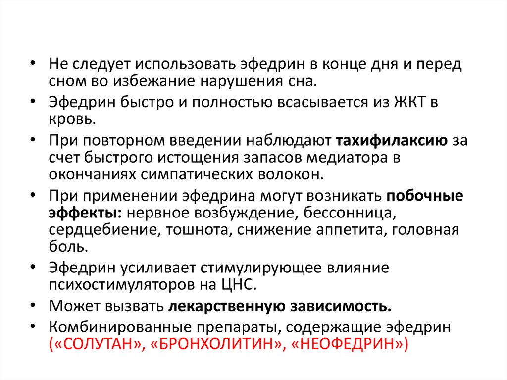 • Не следует использовать эфедрин в конце дня и передсном во избежание нарушения сна.