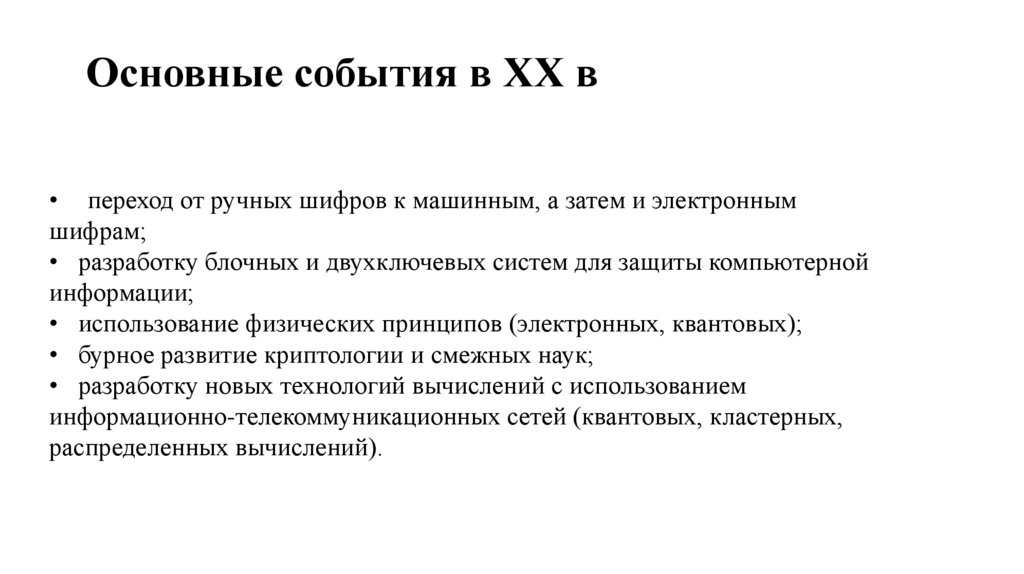 Основные события в XX в• переход от ручных шифров к машинным, а затем и электронным