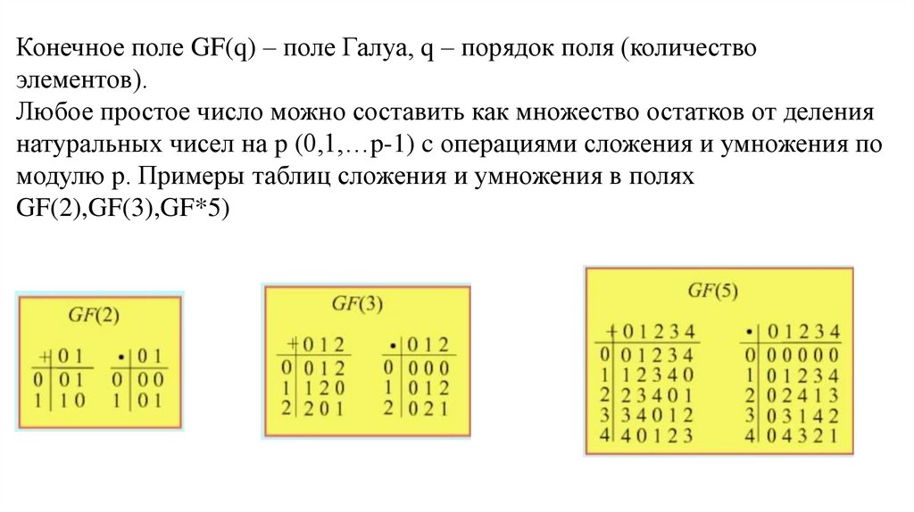 Конечное поле GF(q) – поле Галуа, q – порядок поля (количествоэлементов).