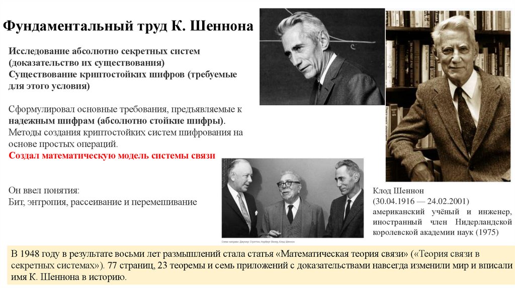 Фундаментальный труд К. ШеннонаИсследование абсолютно секретных систем