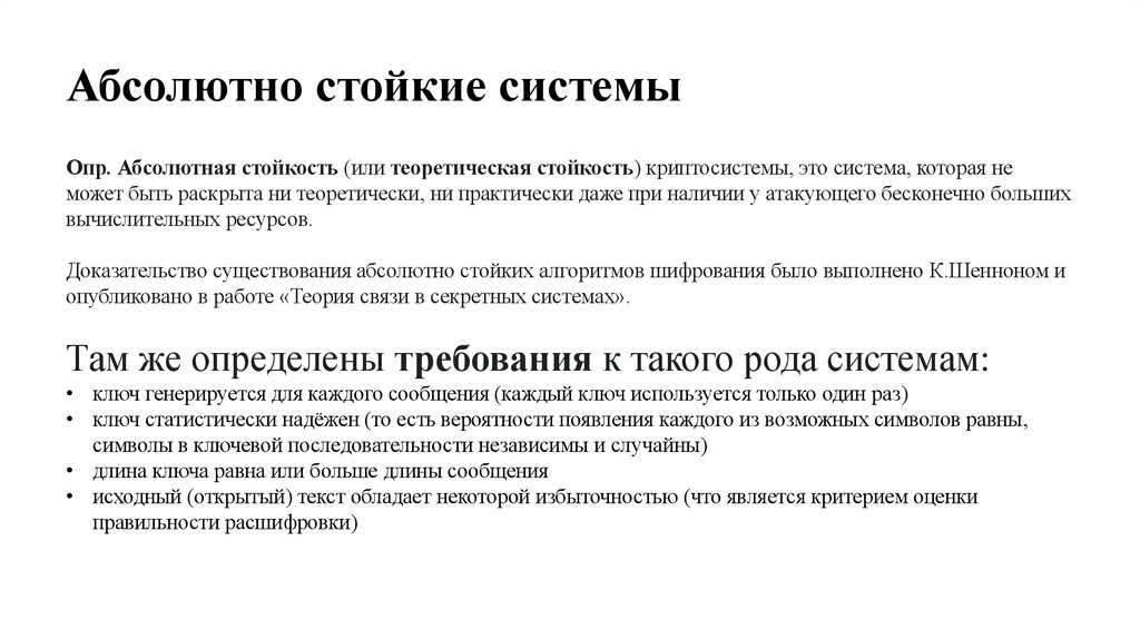 Абсолютно стойкие системыОпр. Абсолютная стойкость (или теоретическая стойкость) криптосистемы, это система, которая не