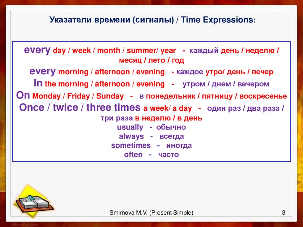 Указатели времени (сигналы) / Time Expressions:)every day / week / month / summer/ year - каждый день / неделю /