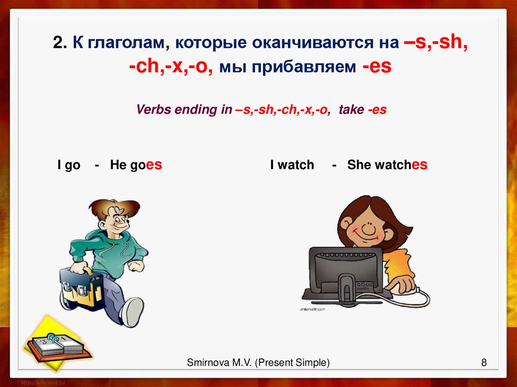 2. К глаголам, которые оканчиваются на –s,-sh,-ch,-x,-o, мы прибавляем -es
